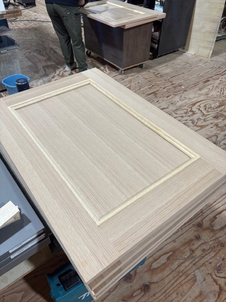 あゆみんは、新しい現場の収納家具を製作中です😊♪♪♪なんか今までの面材と違う〜⁉️気づきましたか❓そうなんです。今まではメラミンとか、樹脂素材の面材しか作らせてもらえませんでしたが、今回はいよいよ天然木の化粧面材を任されました😆😆😆やった➖‼️しかも飾りの縁材がついて、なんか高級そう。ちょっと、ちょっと、なんか豪華ぢゃん⁉️