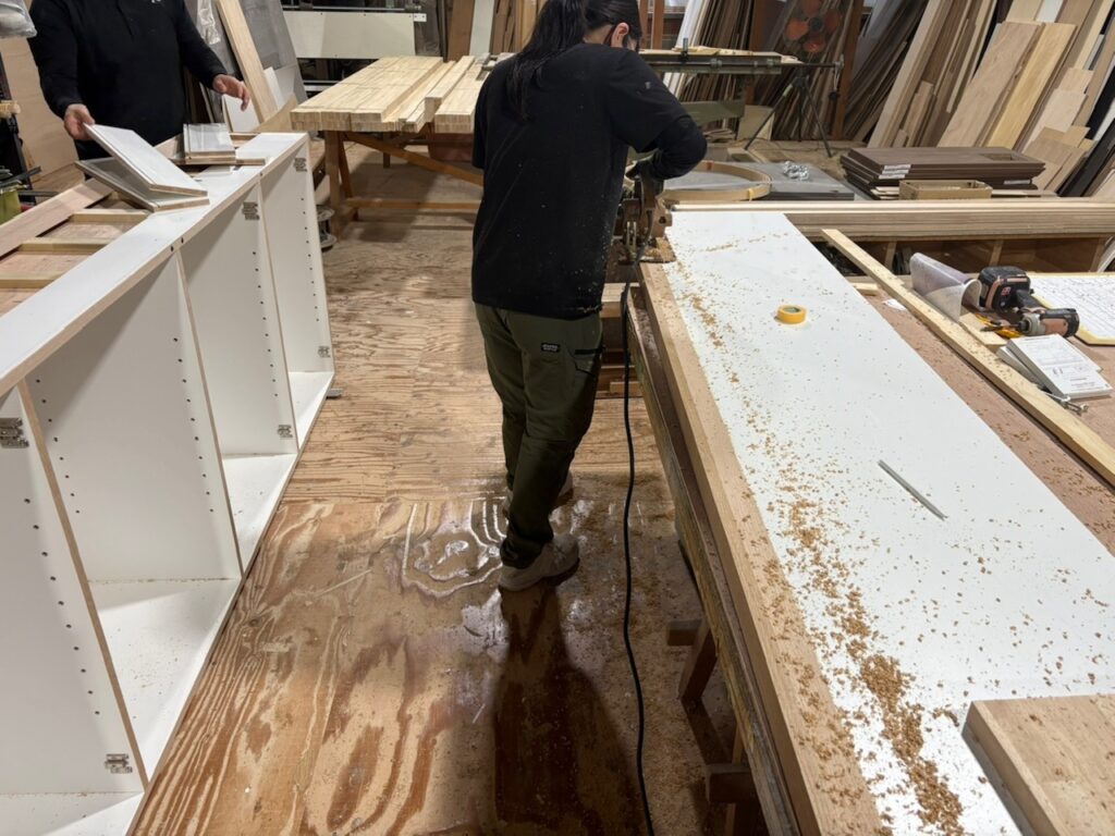 今日は練り付け収納家具のカウンターを仕上げています🤗カウンターの見附にオーク材の無垢材を取付け、余分な部分を削ります。メジ払いという初めての機械で削っていきます。刃の深さの加減や、機械を当てる角度を間違うとゴリっといっちゃいます‼️コワ〜イ😅失敗しないように慎重にゆっくり削りますね。いっぺんに削らずに深さを少しずつ変えながらゆっくりいきや‼️ちょっと、外野うるさい😁😁😁
