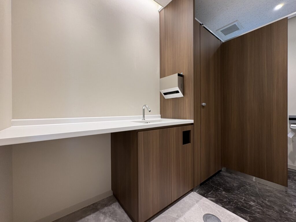 センスのいい洗面室です。今風ですね😊綺麗なトイレで、テンション上ります❗️洗面台にカウンターが付いていて、便利なんですよね〜😊ちょっとした心遣いが女子としては嬉しい限りです‼️洗面台の扉に開いた穴に、ペーパータオルを捨てるゴミ箱を入れるスペースがあるんですね。まっことよく考えられてますね😃😃😃