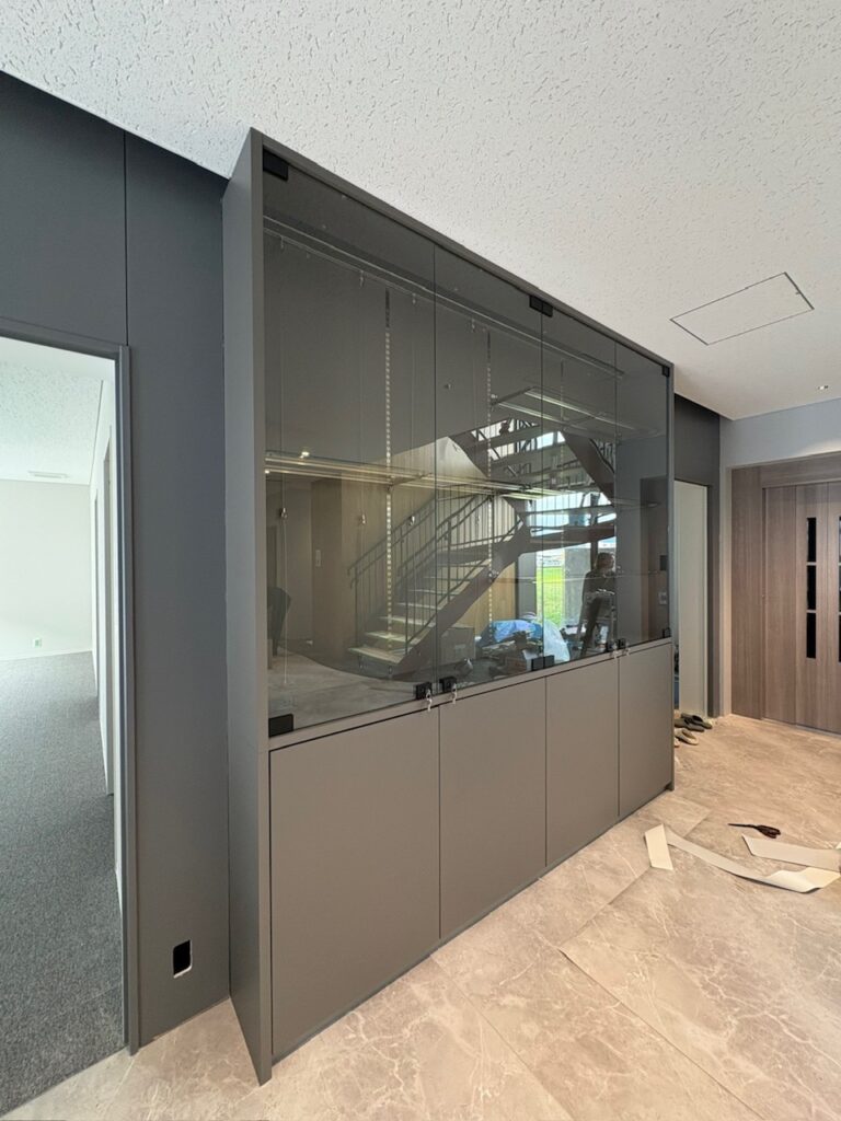 じゃじゃ〜ん❗️やっぱ天井いっぱいの家具は迫力ありますね😃しかも天井高〜い‼️2600㎜です。いっぱい物入ります😊しかも上半分は透明ガラスの透け透けショウケースです。