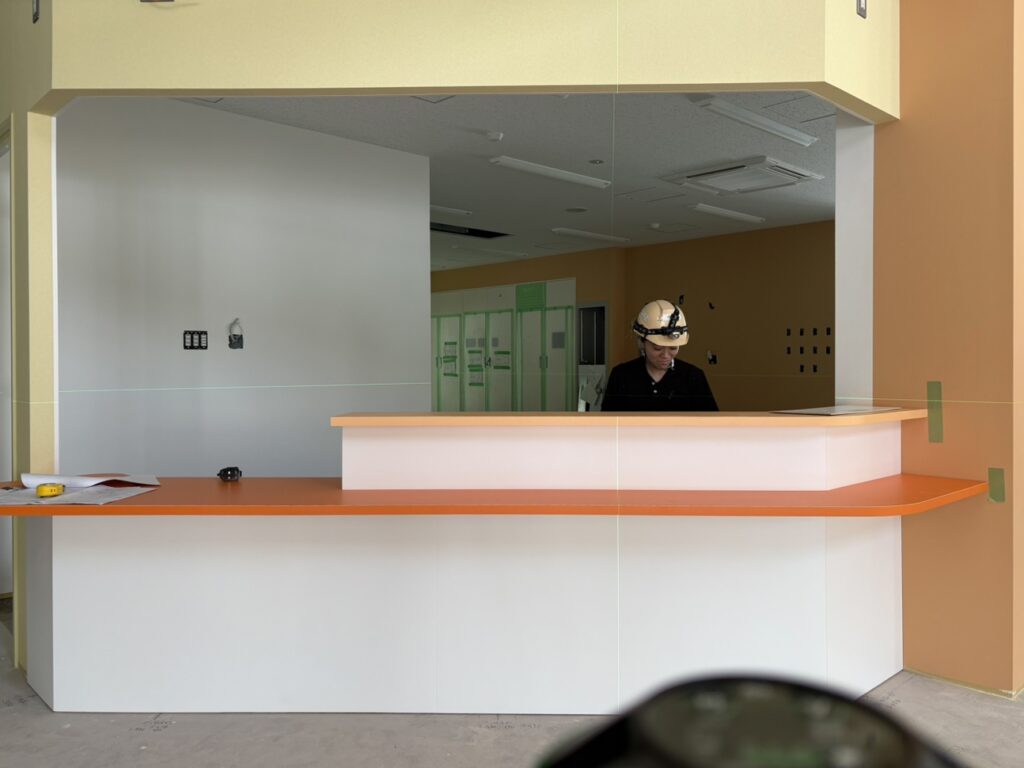 プール施設には、派手な色もよく似合います。普段は滅多に使わない原色カラーのカウンターですね😊薄目のオレンジ色と濃いめのオレンジ色がいい感じの組み合わせになっています。壁がイエローとホワイトになっていて、なんか地中海の街並みみたい😄なんかウキウキする〜⁉️