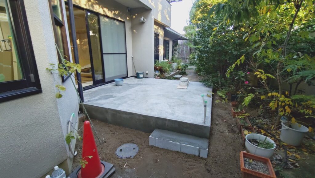 改装中のこちらの居宅では、広いお庭をいかして、奥様の夢のガーデンテラスを作ることになりましたっ😊コンクリートを打設して、これから仕上げに白いタイルが貼られます❗️外の気持ちのいい空間で、白ワインなんか飲んだら最高😆ですね‼️なんで白なん⁉️