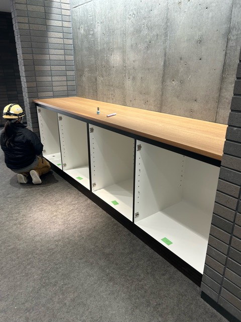 あゆみん製作のカウンター収納です🎵コンクリート打ちっぱなしとタイル仕上げの格好いい壁に取付してます🤗もともと家具をつくる仕事がしたかったのですが、現場に来ると、工場を出た家具がどんな所でどんな風に使われるのか、よくわかります😊なんかいいよね❤️