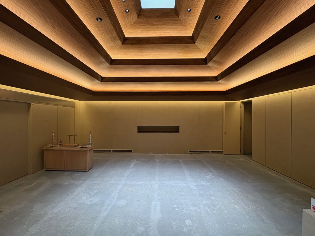 これまた凄い空間に来てしまいました😰天井が何層にも重なって、関節照明で綺麗に浮かび上がってます❗️どことなく寺社仏閣に来たような❓五重の塔のようにも見えますね➖⁉️とにかく新しくて、しかもどこか懐かしさを感じる和の空間です🎵